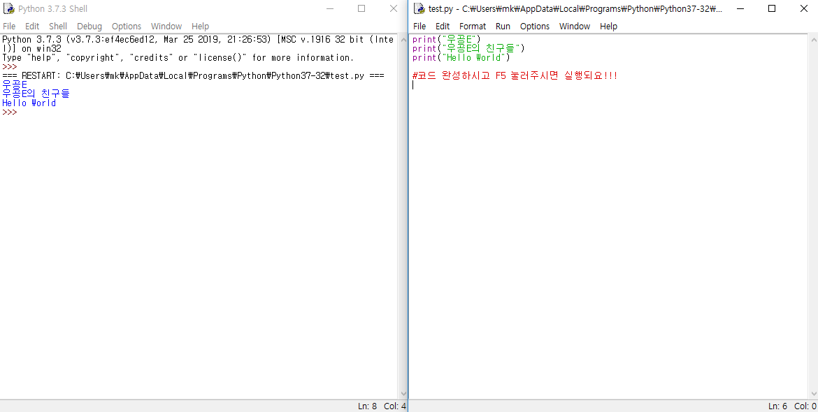 왼쪽 창의 경우는 File에서 New File 눌러주시고 이와 같이 결과값을 출력 할 수 있습니다.