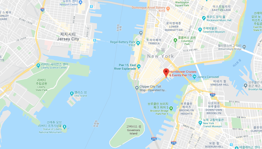 아참 참고로 제가 탔던 크루즈 선착장은 아래의 빨간점 Pier 15 (HORNBLOWER SIGHTSEEING CRUISES) 이었습니다.