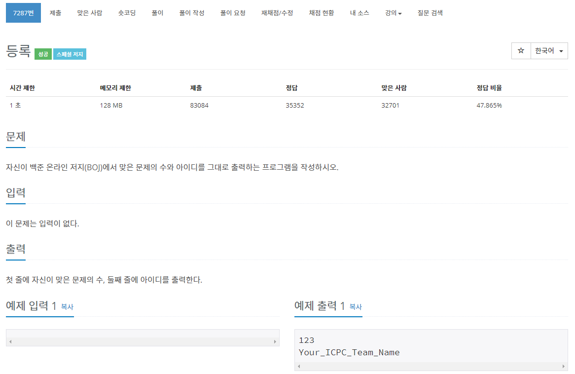 아니.. 스페셜 저지 문제라서 "와.... 어렵다. 서버에서 정보를 불러와서 값을 출력해야되는건가???" 라고 한참 고민하다가 답이 안나와서 정답 비율보고.. 와 백준 푸는 사람들은 다르구나 벙쪄있다가 구글 검색 후 심각한 현타....