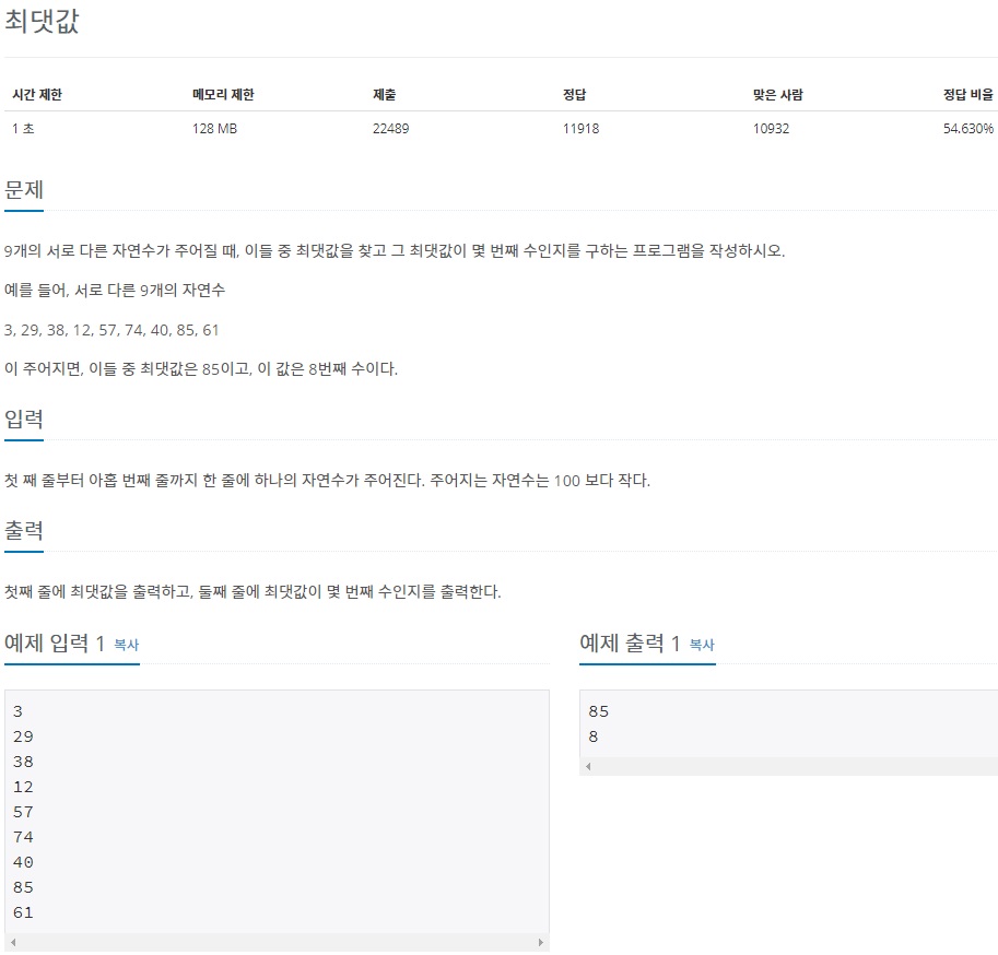 처음에 접근은 C++ 처럼 반복문을 이용해서 배열에서 최댓값을 구하고 반복 과정에서 다른 변수를 이용하여 최대값의 index를 저장하려고 하였는데, 파이썬의 경우는 더욱 간단하게 풀 수 있다.