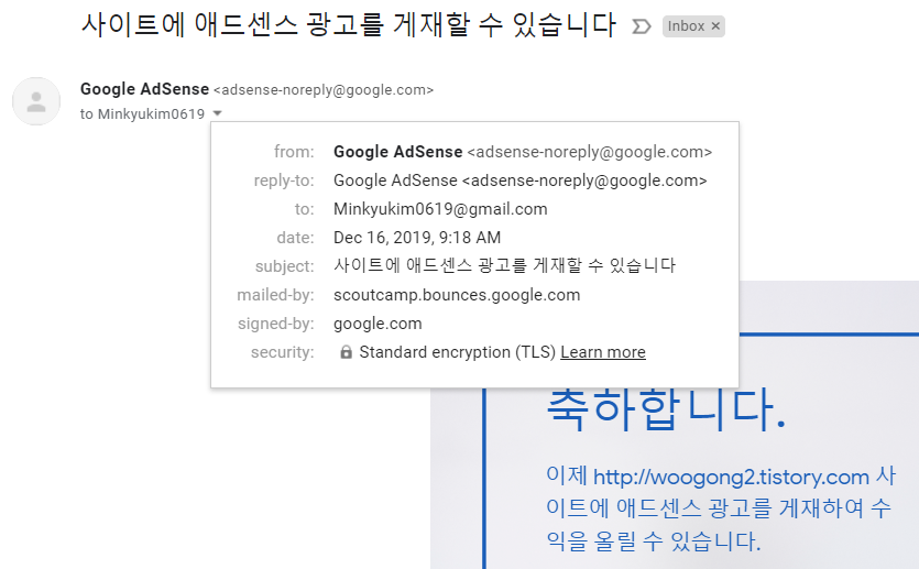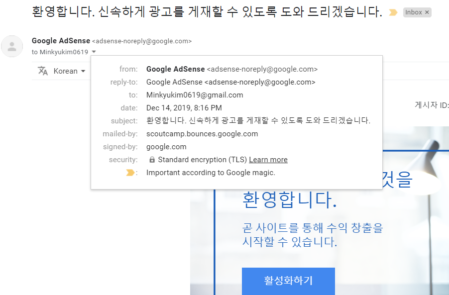 그리고 신청은 12월14일에 넣어 16일에 광고삽입 승인 결정 메일을 받았다.