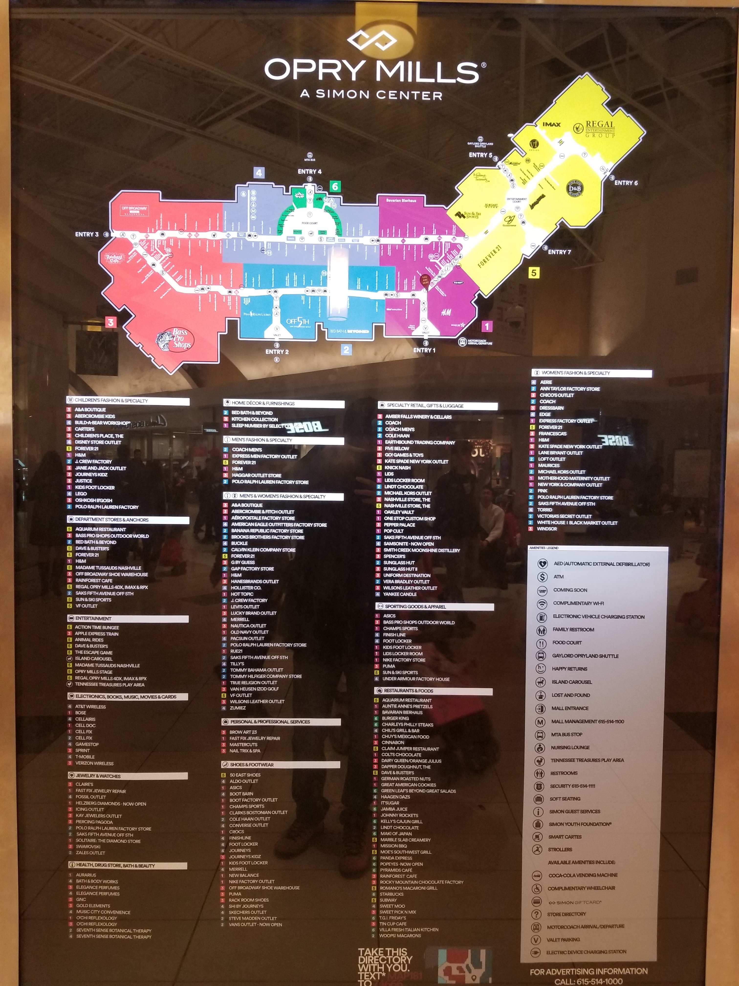 오프리 밀스 쇼핑센터의 지도, 생각보다 꽤 크다. 네슈빌도 시골이라 생각했는데 전반적인 쇼핑몰 분위기 괜찮았다.