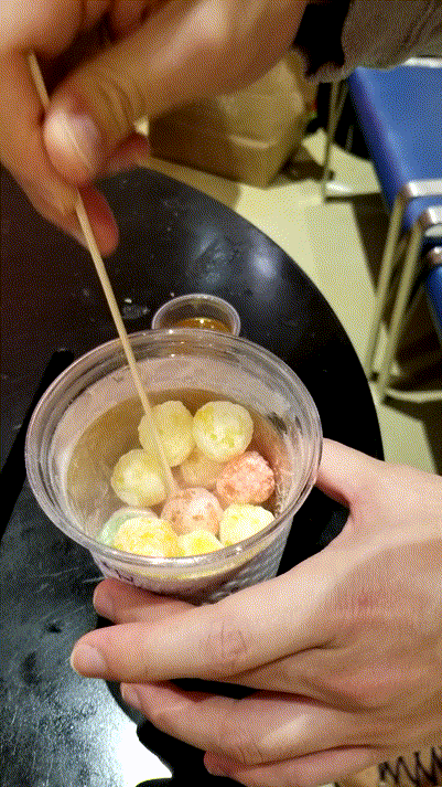과자는 그냥 마트에서 쉽게 볼수 있는 뻥튀기 느낌의 과자. 이거를 오른쪽에 보이는 액체 질소에 담가뒀다가 퍼서 주면 끝. 제일 작은게 8불 정도, 큰거는 거의 9불 (텍스포함). 가격이 음.......