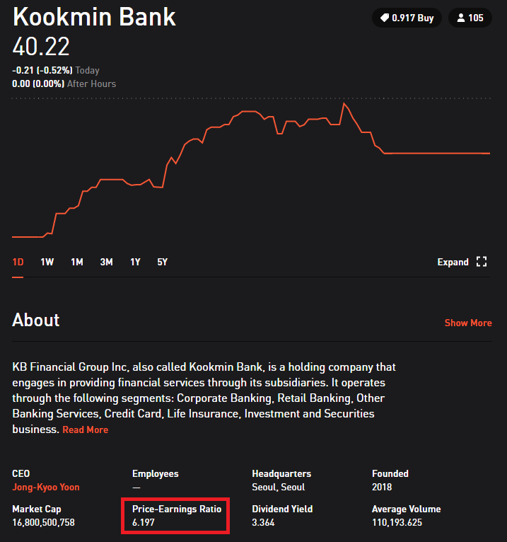 현재 전세계적으로 강제적으로 낮은 이율을 유지할 뿐더러 코리아 디스카운트로 말도 안되는 PER을 나타내고 있는 국민은행.