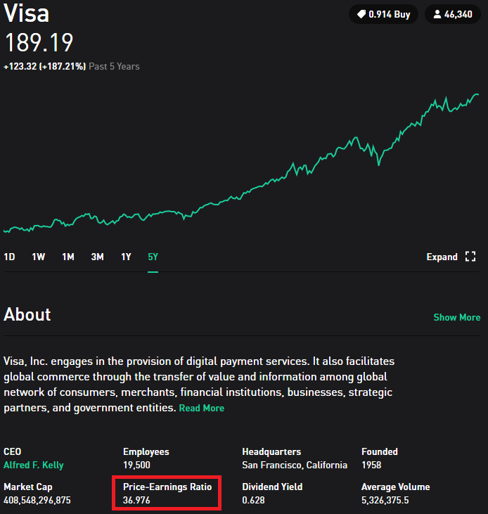 미국의 대표적인 우량주 Visa의 주가를 살펴보면 PER이 대략 37인 걸 알 수있다.
