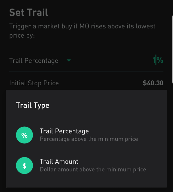 1번의 경우 예를 들어보자. 현재 가격이 $39.90인 경우 1% 로 트레일링 스탑오더를 넣게 되면 우선 주문 발동 가격이 ($39.90 * 1.01) = $40.30으로 설정이 된다. 만약에 하락해서 주식 가격이 $38.00이 된 경우 주문 발동 가격이 ($38.00*1.01) = $38.38로 재 설정이 된다. 하락이 멈추고 다시 상승을 시작할 경우 $38.38에 도달하는 경우 시장가로 주문이 접수되면서 주식을 매수하게 된다.