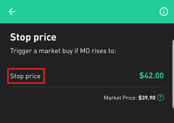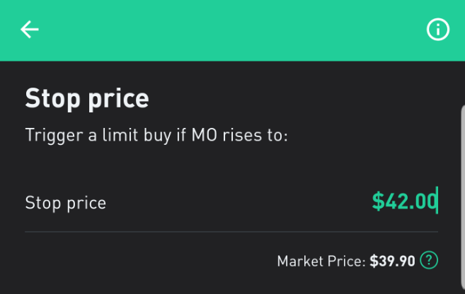 주식 가격이 상승추세를 시작할 것 같은 지점에서 이 주문을 사용한다. 위의 예는 알트리아 주식 가격이 $42.00에 도달하게 되면 시장가로 매수가 들어가게 된다. 시장가로 주문이 들어가는 거라 $42.00 이상에서 체결될 확률이 높다. "끊임없는 상승추세가 시작되는 게 확실하다" 생각될 때 사용해야 한다.