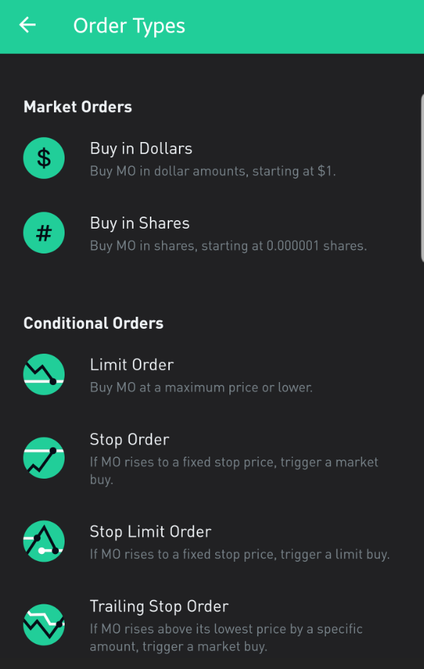 미국 증권사 로빈후드 앱 사용법, 주문 종류 설명